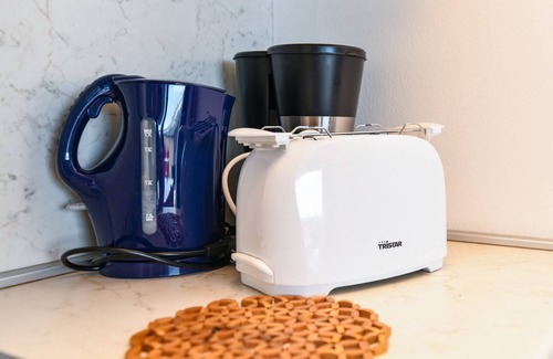 Kitchen: microwave, electric hob, fridge, toaster, kettle, coffee machine.