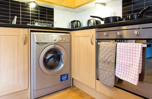 The stylish apartment has a super-king bed which can also be set-up with two single beds. Fresh linen is supplied. The bathroom has a shower over the bath and complimentary towels and toiletries are available. The kitchen comes fully equipped with all the essential items with plates, cutlery and cooking utensils, access to a fridge-freezer, oven, hob, toaster and microwave.